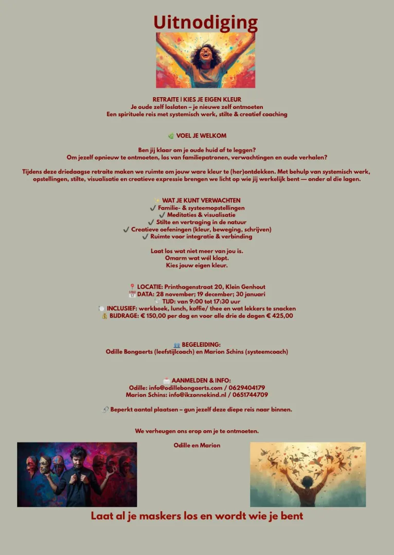 Ben jij klaar om je oude huid af te leggen en je diepste zelf te (her)ontdekken? Tijdens deze 3-daagse retraite nodigen wij je uit om ruimte te maken voor jouw ware kleur. Samen met systeemcoach Marion Schins begeleid ik je in het doorbreken van ingesleten patronen en het ontdekken van wie jij werkelijk bent.